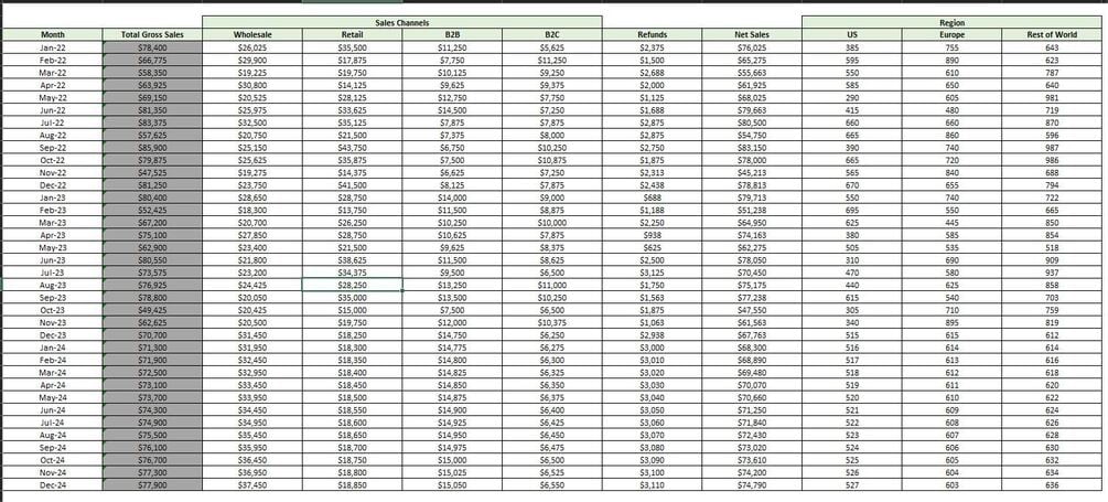 - Up to 4 channels already in this template: Wholesale, Retail, B2B and B2C