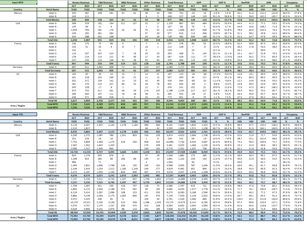 All the above visual dashboards simply update and give you a clear picture of how your hotels are doing simply by plugin in month to date and year to date figures on this sheet.