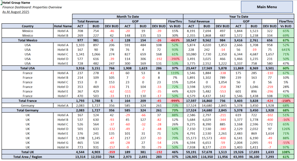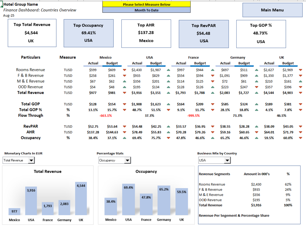 Dig deeper and now look at performance of every country individually. Make it a competition! KPI cards will automatically show which country has the best Total revenue, occupancy, AHR, RevPAR and GOP%. This can not only be run to view the month's performance but also year to date performance. Review each country's GOP flowthrough to look for areas of improvement to further drive profitability. Dynamic graphs included in this sheet include Monetary charts: Toggle between revenues per segment or view total revenues at once by country. Percentage Stats: Toggle between occupancy and GOP % by country. Business mix by country to view which segments are driving your top line.